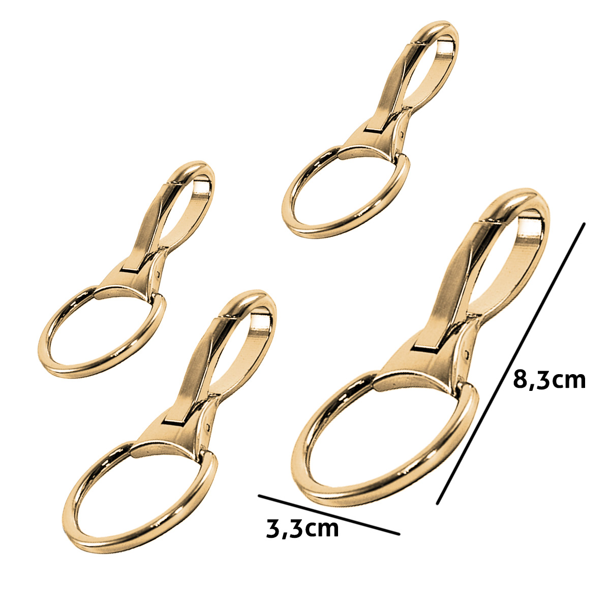 6 unidades 8,3cm de comprimento 3cm e 3,3cm de tamanho interno Indicado para chaveiro, bolsas e carteiras