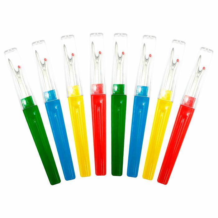 Abridor de caseados Grande Colorido SP423, Caixa com 50 Unidades, usado como faca para abrir casas de botão, desmanchar costuras e alinhavos. Também chamado de descosturador. Composto por Aço e Plástico. Tem um tamanho Total de 12cm.