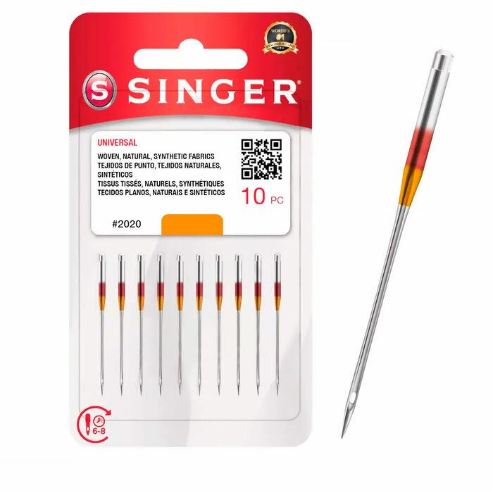 Agulha para máquinas domésticas Nº2020 marca Singer, pacote contendo 10 unidades. A Agulha 2020 Singer é ideal para cem tecidos de algodão de espessura fina ou leve. A Agulha para Tecido de Algodão desliza entre a trama dos tecidos sem puxar fios ou furar devido a uma ponta cônica arredondada, evitando danos ao material.