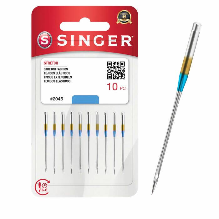 Agulha para máquinas domésticas Nº2045 marca Singer, pacote contendo 10 unidades. A Agulha 2045 Singer é ideal para costurar Malhas e Tecidos Elásticos com elasticidade de espessura encorpada. A Agulha para Malha e Elástico desliza entre a trama dos tecidos de malha, sem puxar fios, devido a uma ponta arredondada, evitando danos ao material.