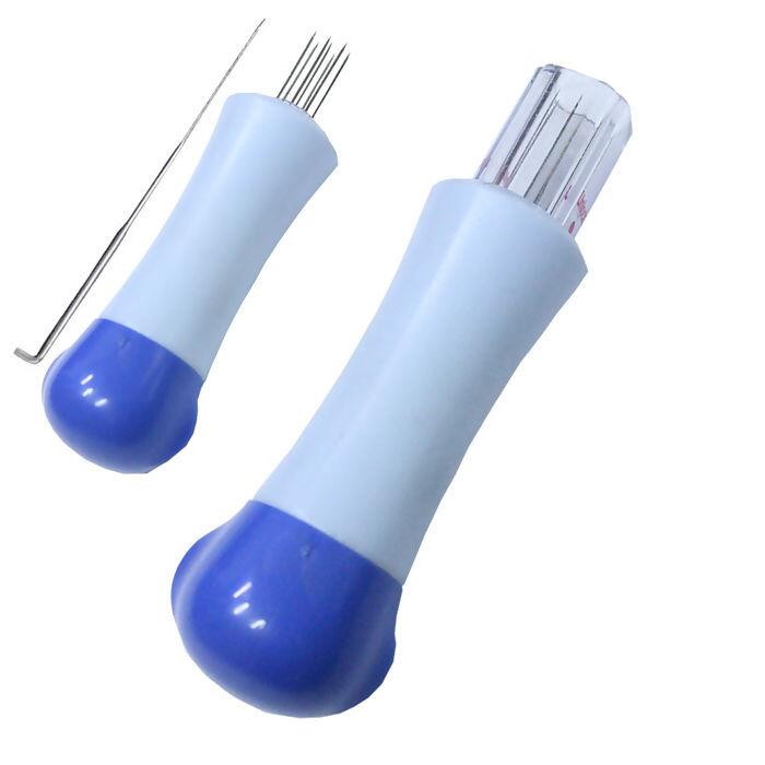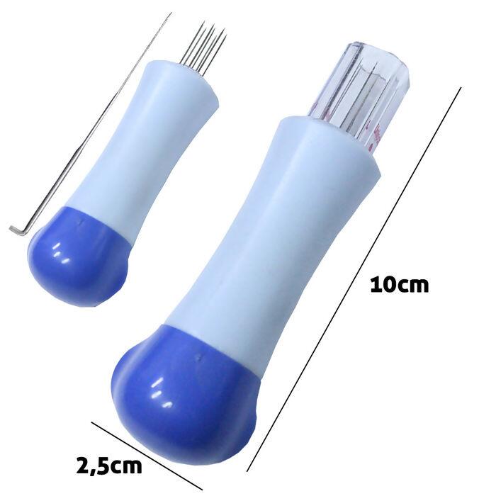 Agulha de Feltragem com 7 agulhas, perfeita para feltragem pois deixa um melhor acabamento com maior agilidade, sendo de fácil manuseio e sem necessitar de muita força devido ao seu sistema de mola. Possui uma trava de segurança para evitar acidentes, para destravar basta girar o acrílico presente na ponto do produto de acordo com as marcações em vermelho. Para trocar as agulhas, desrosqueie a base e remova a tampa de metal. Outras agulhas são vendidas separadamente.