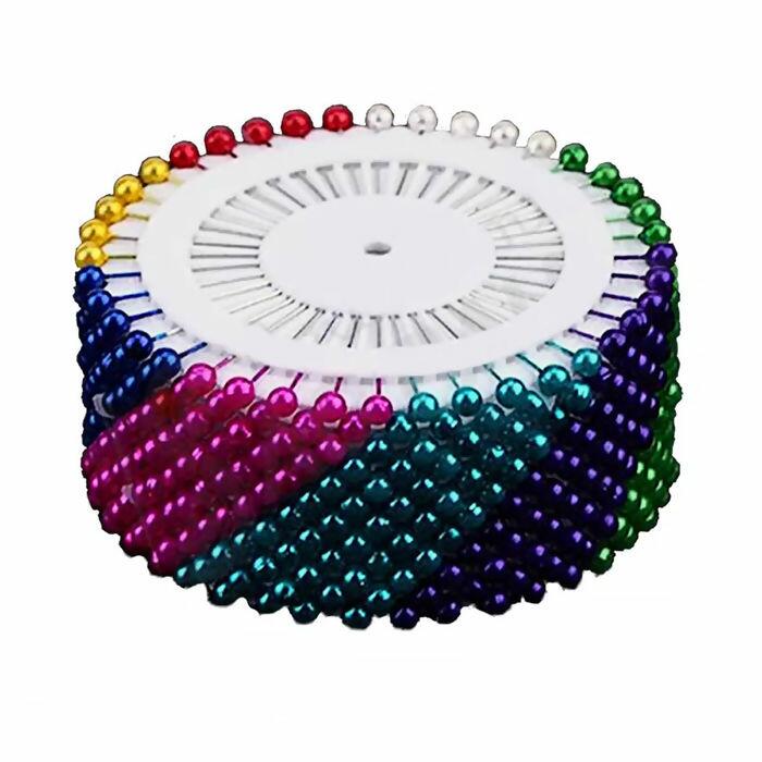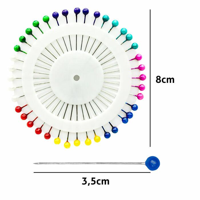 Alfinete com Cabeça redonda em diversas cores distribuídas em um disco para organizá-los e guardá-los em segurança, muito utilizado para marcar e prender tecidos a serem cortados, costurados, etc. Cada disco contém 40 unidades, totalizando 480 alfinetes