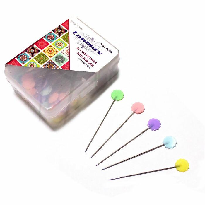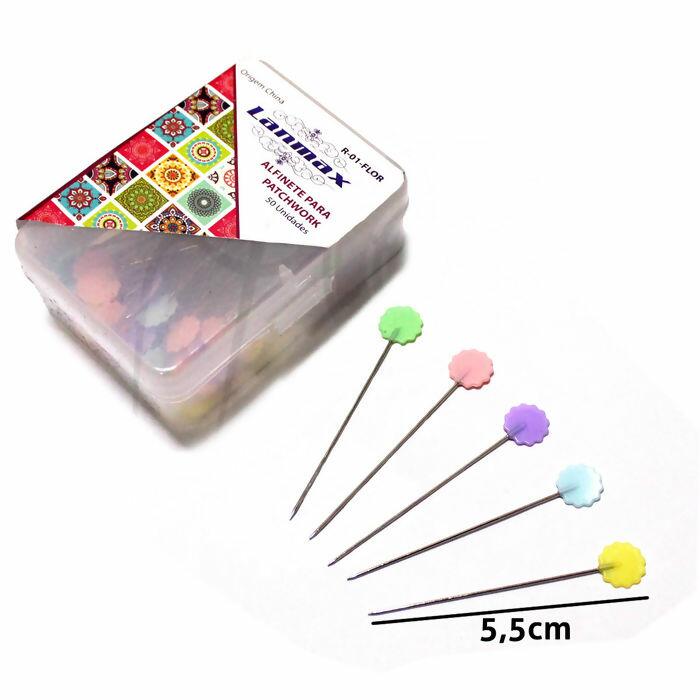 Alfinetes de 55mm com cabeça em formato de flor Perfeitos para patchwork e costura criativa Utilizados para prender e marcar tecidos Caixa com 50 unidades