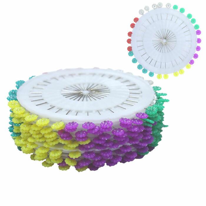 Alfinete com Cabeça em formato de flor em diversas cores distribuídas em um disco para organizá-los e guardá-los em segurança, muito utilizado para marcar e prender tecidos a serem cortados, costurados, etc. Cada disco contém 30 unidades, totalizando 360 alfinetes