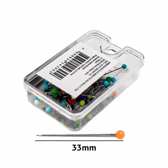Alfinete feito de metal e a cabeça de Vidro 1 Caixinha com 100 alfinetes Alfinete medindo 33mm Cores das cabeças dos alfinetes são sortidas