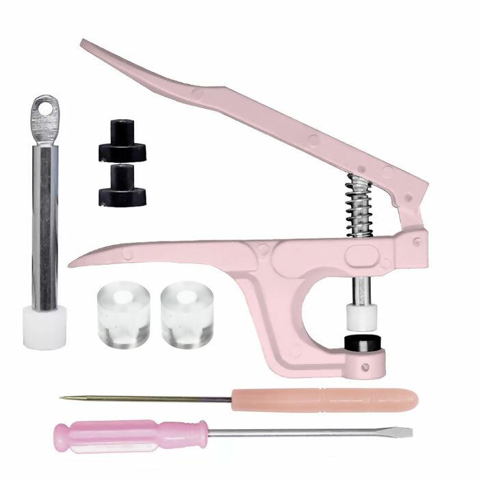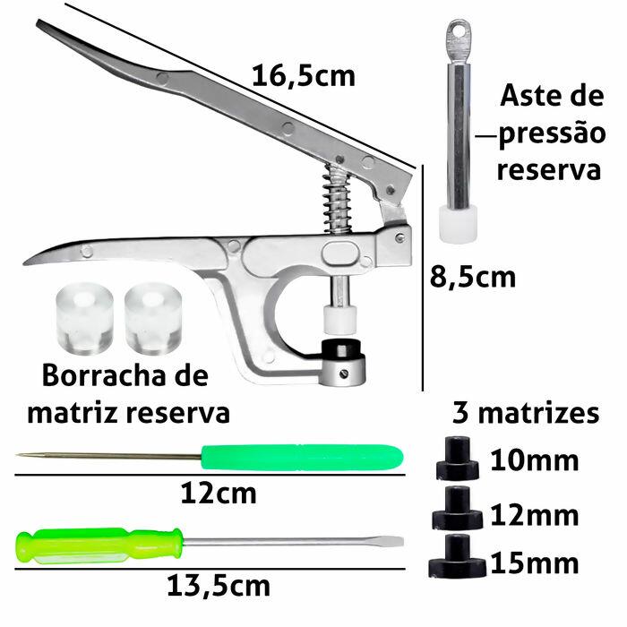 Adequado para botões de 10mm, 12mm e 15mm Fácil de usar com ajuste simples da matriz Cores disponíveis: verde ou rosa (conforme estoque) Ferramenta leve e prática