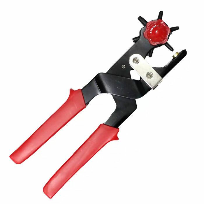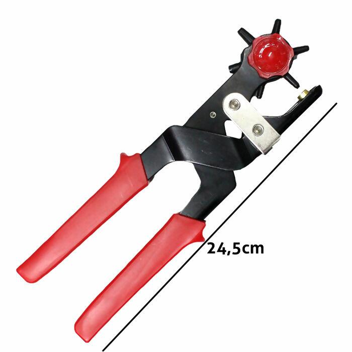 Alicate furador feito totalmente em metal resistente Possui diferentes tamanhos de furação Ideal para artesanato, customizações e confecção Proporciona aplicação prática e acabamento limpo