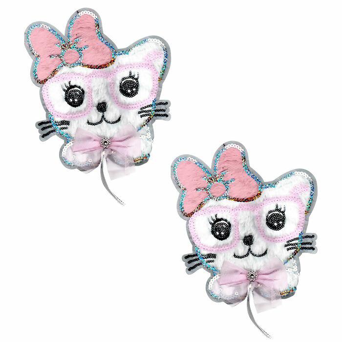 Aplique Costurável Gato com Óculos SP398, 20 Unidades. Perfeita para decorações de artesanatos e customização de panos e roupas, dando uma aparência delicada à peça! Feita com 50% Poliéster e 50% Plástico com um tamanho de 18cmx20cm
