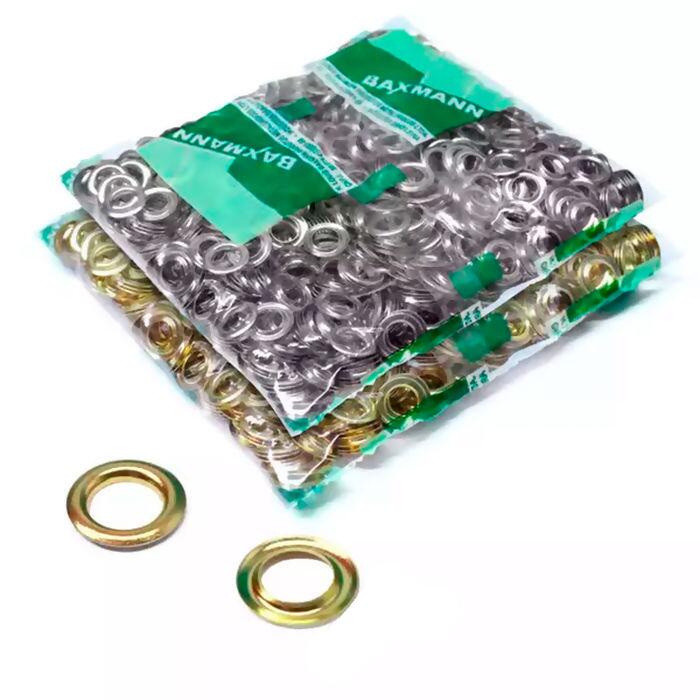 Arruela número 45 Baxmann feito totalmente de ferro com acabamento em latão, cada pacote contém cerca de 1000 unidades da arruela. A Arruela de metal é indicado para diversas aplicações junto ao ilhós, como por exemplo para abrir um caminho para passagem de cordões, criar ventilação na peça ou para decoração da peça! Também é utilizado em gráficas na produção de rifas e lonas.