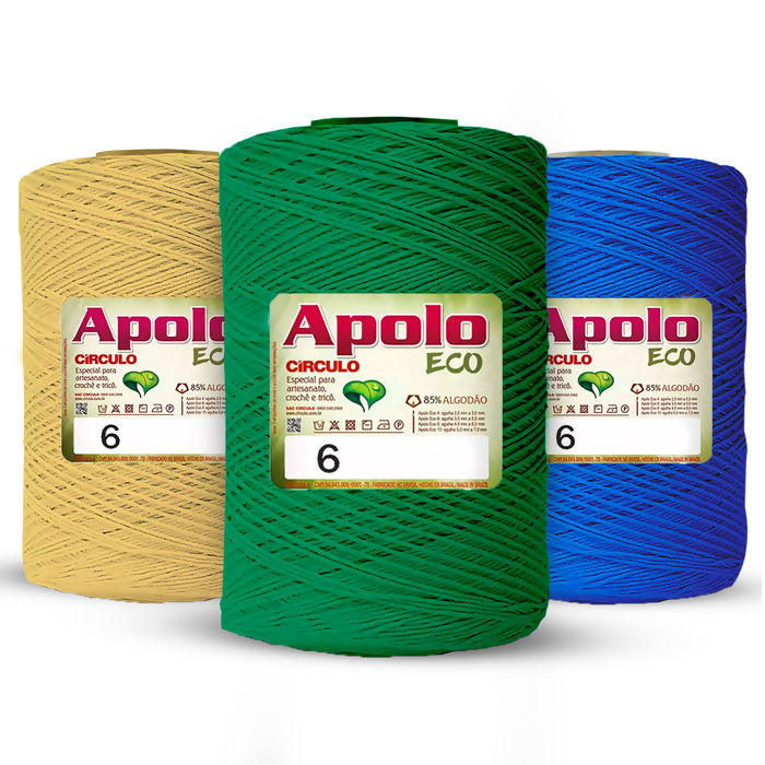 O Barbante Apolo N6 Círculo é composto por 85% algodão, TEX 984, sendo cada novelo com 1800kg. O Barbante Apolo é Indicado principalmente para a confecção de peças de decoração, o Apolo mostra-se versátil e com um excelente resultado quando utilizado para a confecção de acessórios, como bolsas de praia, por exemplo. Use agulhas de crochê 3,5mm à 5mm.