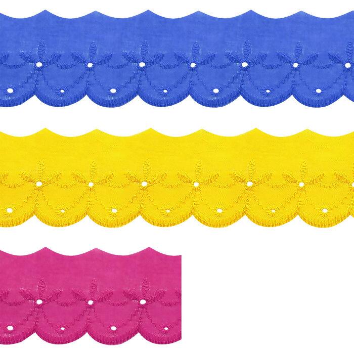 Bordado Inglês referência BP090 marca Arte Punto em diversas cores, cada pacote contém aproximadamente 13,7 metros do bordado com largura de 5cm. Feito totalmente de Poliéster, essa linha de Bordado Inglês é ideal para decoração e customização das mais diversas peças como panos de prato, lençóis e muito mais.