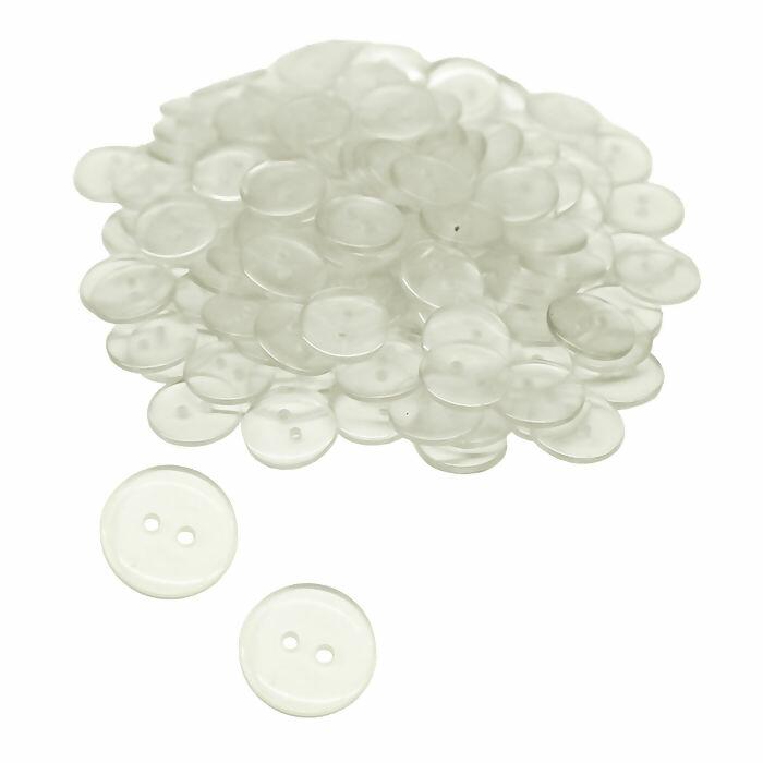 Botão Transparente 15mm com 2 furos, pacote contendo aproximadamente 144 botões. Feito de Plástico, esse botão é ideal para roupas como blazer, sobretudo, jalecos entre outras peças semelhantes, pode também ser utilizada em artesanato de forma geral.