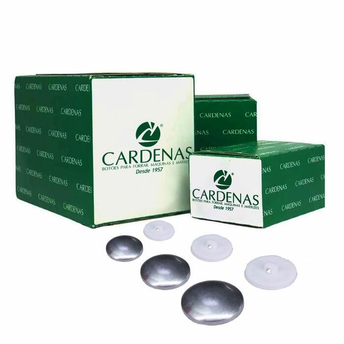 Botão Bombe marca Cardenas feito de alumínio para forrar com os tecidos de sua escolha, a sua base onde é prensado o tecido para encapar o botão é branca e é feito de plástico. Para um forramento perfeito, adquira as matrizes para botão bombe conosco também.