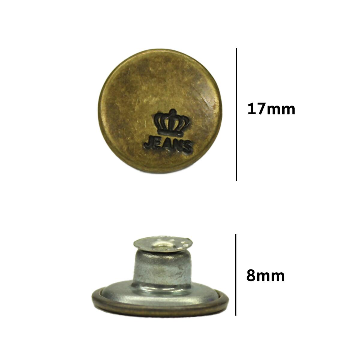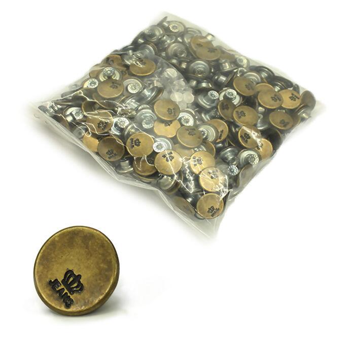 Botão Flex LEB01 Coroa Ouro Velho Jeans, fabricado totalmente em ferro, garante excelente resistência e durabilidade. Cada pacote contém 250 unidades, o botão de 17mm é do tipo flexível, indicado para a produção e confecção de calças, roupas jeans e outras peças que exigem firmeza. Para aplicação correta, é necessário o uso de uma matriz, além de ferramentas como balancim ou prensa, que garantem o encaixe perfeito e seguro do botão no tecido.