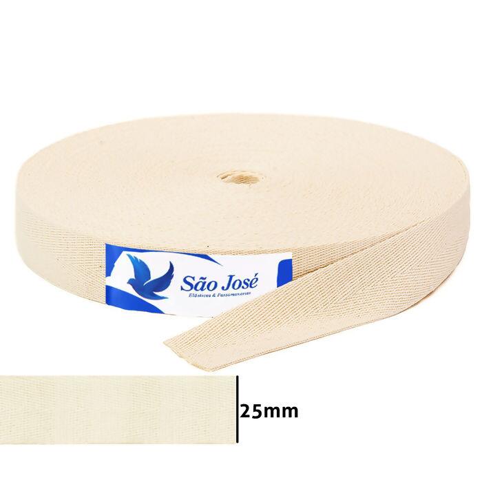 Cadarço de Algodão Sarjado 3025 marca São José, cada rolo contém cerca de 25 metros de cadarço com largura 25mm. O Cadarço Sarjado São José é indicado para diversas aplicações como confecções, reforço de costura, sacolas, bolsas, mochilas, sapatos.