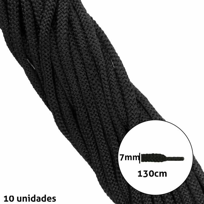 Cadarço com ponteira preto com 7mm de espessura com comprimento de 130cm feito 100% de poliéster, pacote contendo 10 unidades, utilizado na fabricação de roupas como bermudas, blusas e artesanato em geral. A versão luxo possui um trançado mais trabalhado, dado maior conforto e durabilidade ao cadarço.