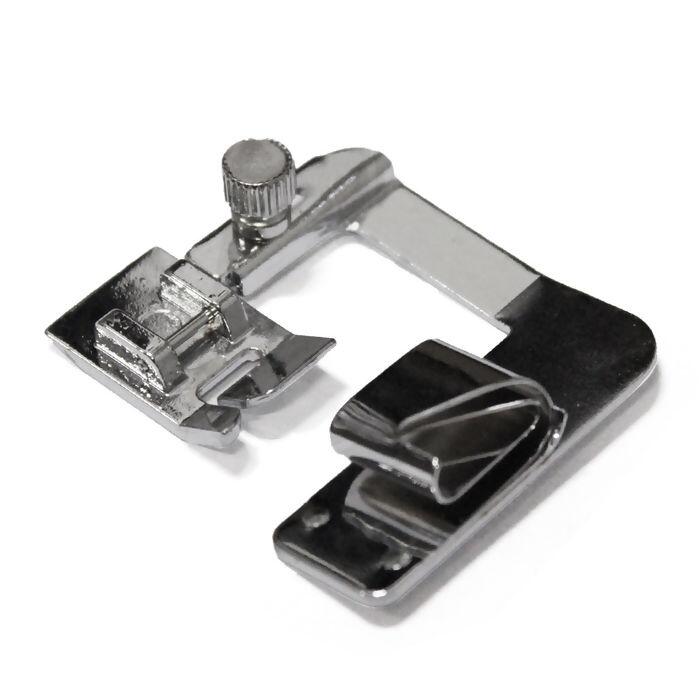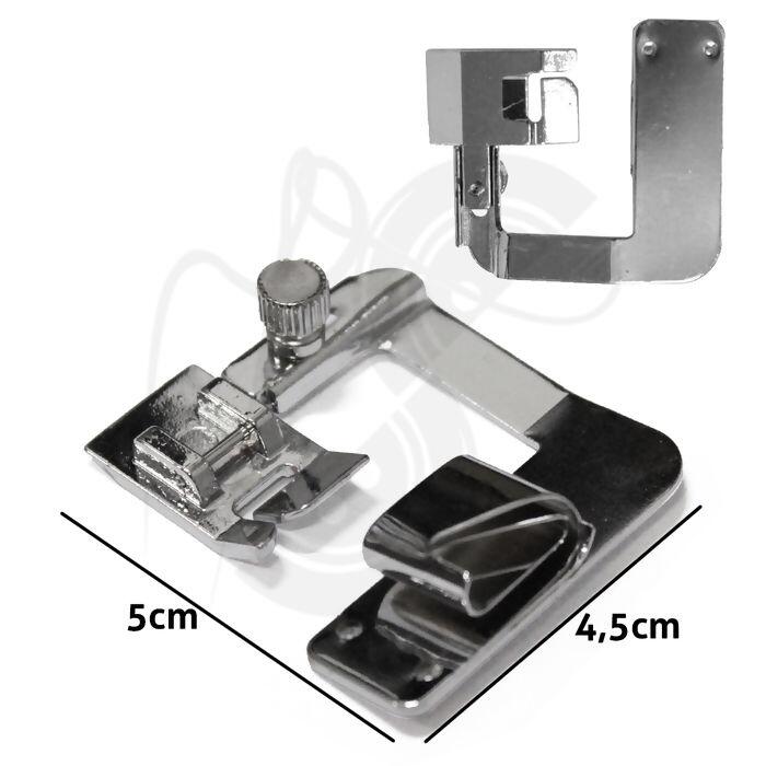 Sapata para barra/bainha de tamanho 25,4mm ou 8/8", produzido totalmente em metal resistente. Este modelo é indicado para máquinas de costura domésticas, oferecendo excelente desempenho em processos de costura, do simples ao profissional. Faça barras com acabamento de alta qualidade facilmente. Necessário haste para troca de calcador.