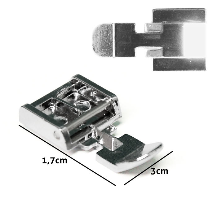 Sapata para zíper com pé largo, feita totalmente em metal resistente, projetada especialmente para máquinas de costura domésticas. Sua base larga proporciona maior estabilidade durante a costura, garantindo alinhamento e controle ao trabalhar com zíperes. Possui canal central que facilita a inserção do zíper e permite costuras mais precisas e uniformes. Necessário haste para troca de calcador.