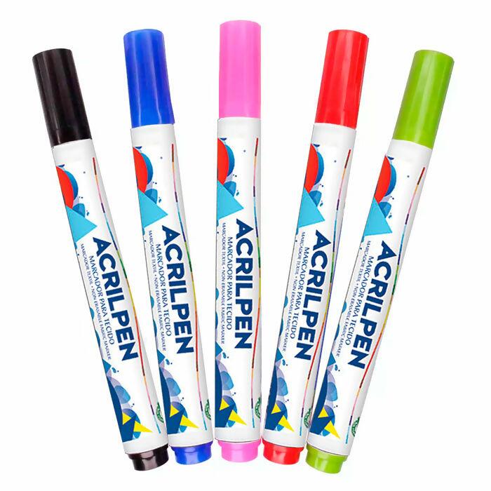 Marcador de tecido Permanente Acrilpen marca Acrilex. A Caneta Acrilpen é ideal para marcação nos mais diversos tipos de tecidos de algodão, garantindo excelente fixação e super resistência à lavagens. Caneta para pintar e marcar tecidos permanentemente, não utilizar em tecidos sintéticos ou engomados.
