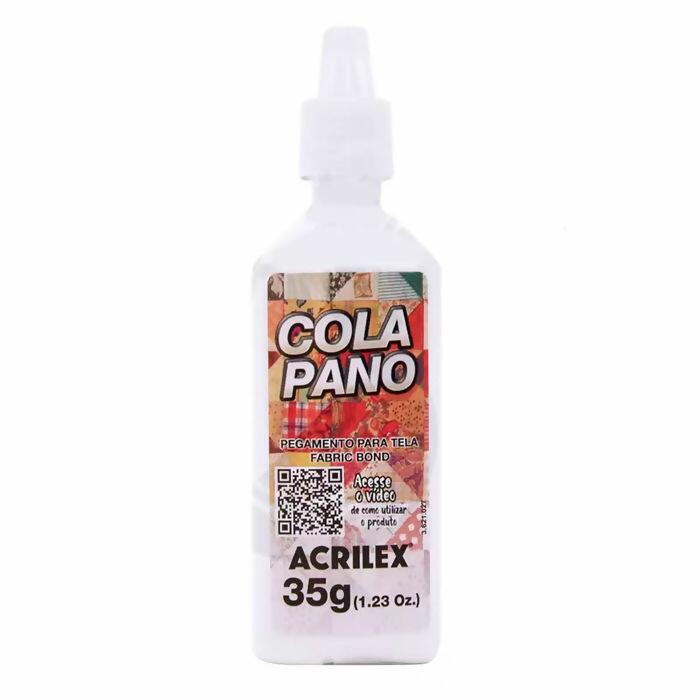 Cola para tecido Pano marca Acrilex, cada frasco contém cerca de 35g. A Cola para Tecido foi desenvolvida especialmente para colar tecidos sobre tecido feitos de algodão. Não é resistente à múltiplas lavagens, Pronta para uso e feita para secagem ao ar!