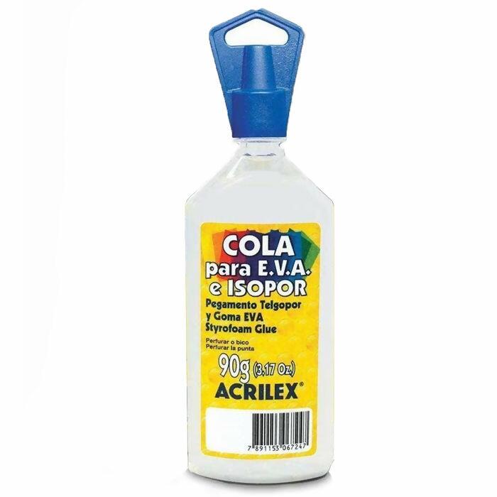 Cola para EVA e Isopor marca Acrilex, cada frasco contém cerca de 90g. A Cola EVA Acrilex foi desenvolvida especialmente para fazer colagens utilizando EVA e Isopor. Não é resistente à lavagens, solúvel em álcool. Pronta para uso e feita para secagem ao ar!