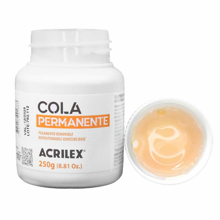 Cola Permanente marca Acrilex, cada frasco contém cerca de 250g. A Cola Permanente Acrilex foi desenvolvida para diversos materiais como: gesso, madeira, cerâmica, metal, vidro, plástico etc.