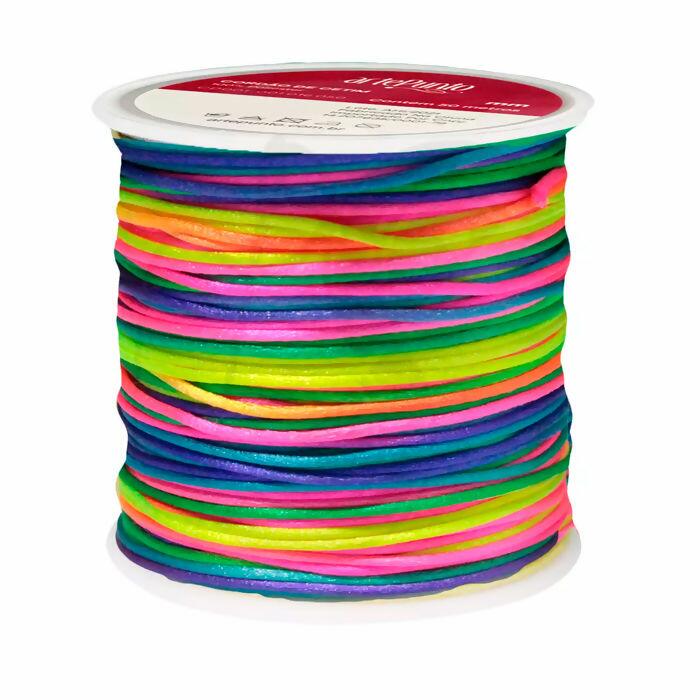 Rabo de Rato Cordão Multicolorido em cores saturadas Cetinado marca Arte Punto, cada rolo contém 50 metros de cordão de 1mm de largura. O Cordão Acetinado Rabo de Rato é indicado para decoração de chinelos, calçados, crachás, semi-joias, lembrancinhas e artesanato em geral.