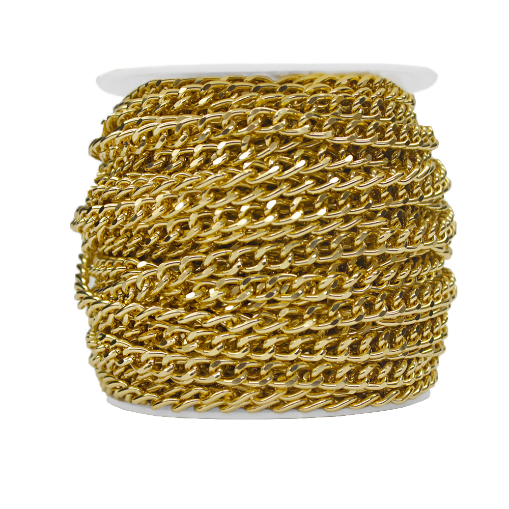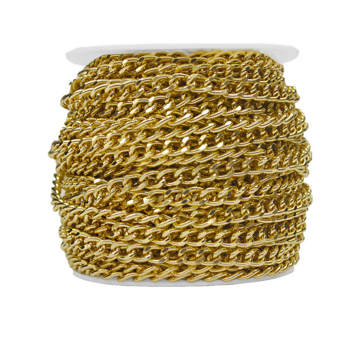Corrente Dourada 7mm Largura, rolo com 25m. A Corrente Dourada é elogiada por sua excelente qualidade e brilho impressionante. Ideal para fabricação de colares, pulseiras, tags, chaveiros, bijuterias, brindes, alças de bolsas e artesanatos em geral. Entregando resultados esteticamente agradáveis.