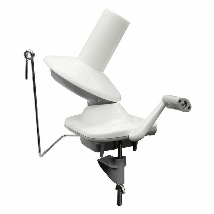 Enrolador de Fio e Lã Manual, para utilizar encaixe o fuso na base em forma de engrenagem, prenda o enrolador de bola a uma superfície utilizando o grampo integral, é possível controlar a braçadeira através do botão vermelho. Rode o guia da linha de forma que o loop fique voltado para cima. O Fio precisa ser suportado em um swift para uma transferência uniforme, a linha deve sempre ir no sentido horário em torno da bobina.