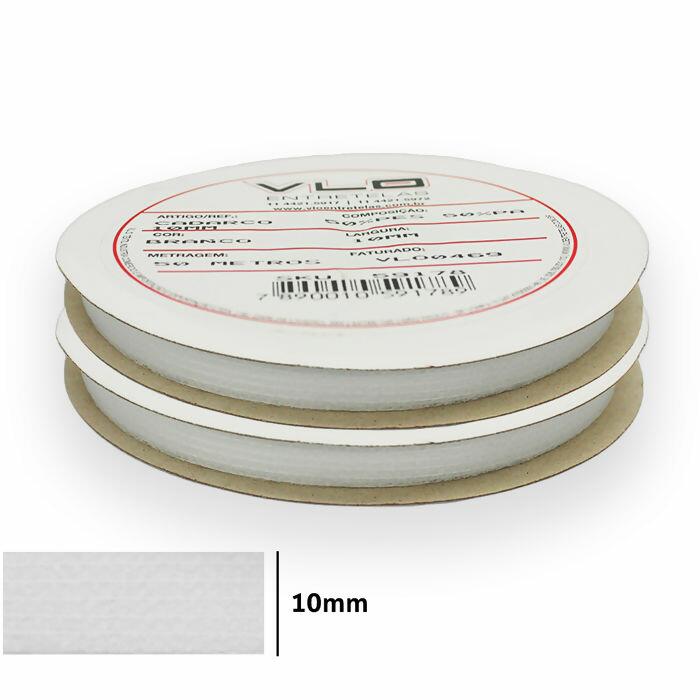 Cor Branco Largura de 10mm e comprimento de 50 metros Usada para reforçar, estruturar e dar acabamento em peças de costura Produzida em 50% Poliéster e 50% Poliamida Ideal para barras, cós, golas, punhos, artesanato e trabalhos de confecção em geral
