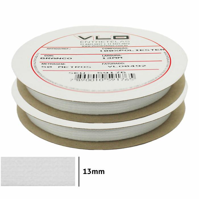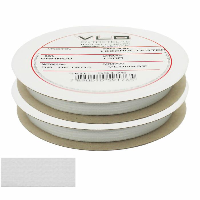 Cor Branco Largura de 13mm e comprimento de 50 metros Usada para reforçar, estruturar e dar acabamento em peças de costura Feito de 100% Poliéster Ideal para barras, cós, golas, punhos, artesanato e trabalhos de confecção em geral