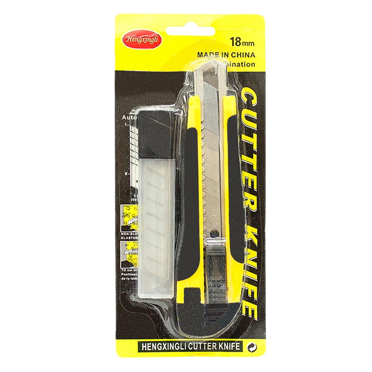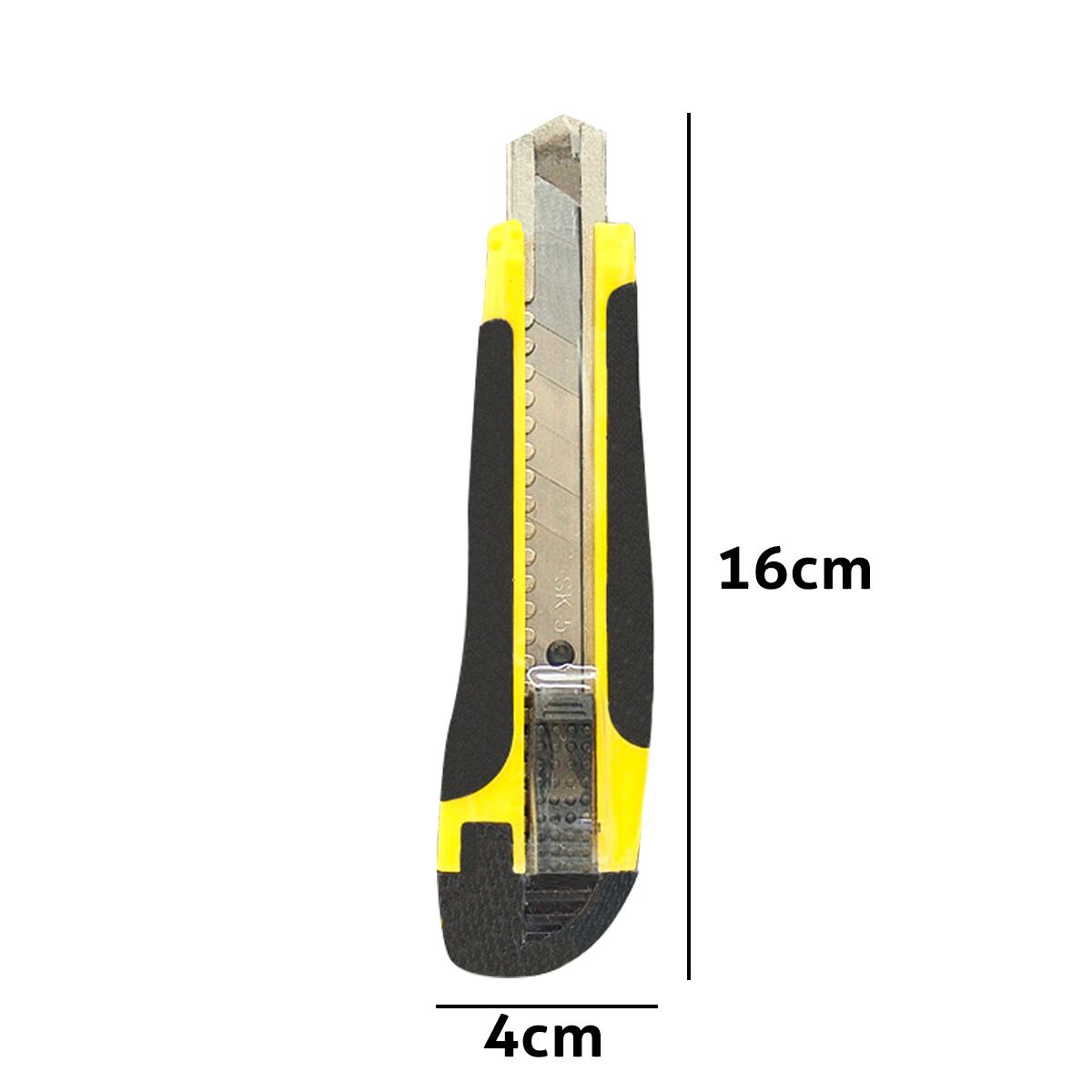 Feito em Metal, Plástico e Borracha 1 Unidade de estilete e 5 Unidades de lâmina extra Com um tamanho de 16cm e uma lâmina de 18cm Possui sistema de quebra de lâmina e sistema de trava para evitar acidentes
