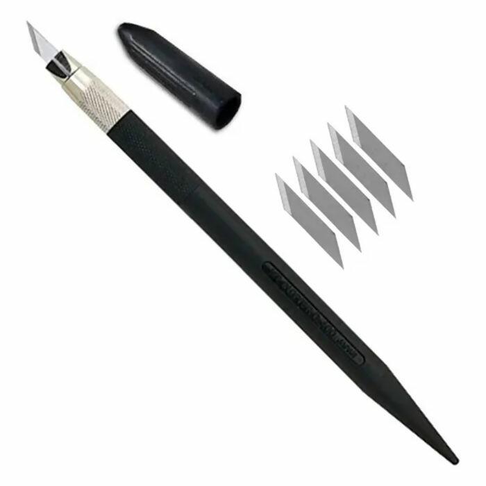 Estilete caneta de precisão feito totalmente de metal, acompanha junto ao estilete cinco lâminas, sendo uma já acoplada à caneta, e uma caixa para guardá-las com segurança, indicada para cortes precisos em papel, vinil e os mais variados tecidos.