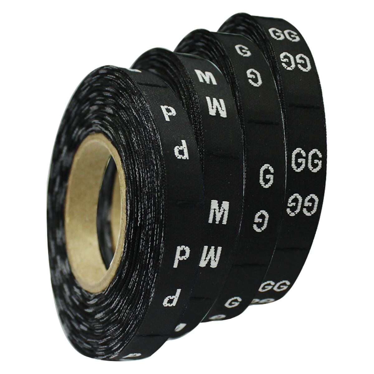 500 unidades; Tamanhos: P, M, G e GG; Rolo com fundo preto e letras em branco; Ótima qualidade, ideal para peças de vestuário; Serve para organizar e identificar roupas;