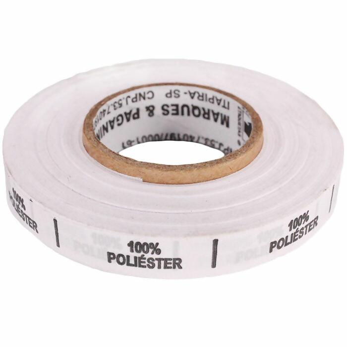 Etiqueta de composição 100% Poliéster para roupas. Organize e identifique peças de vestuário. Acessório de ótima qualidade, ideal para peças como saias, shorts, camisetas, blusinhas e muitos outros produtos. Venda de rolo com 1000 unidades de etiqueta.