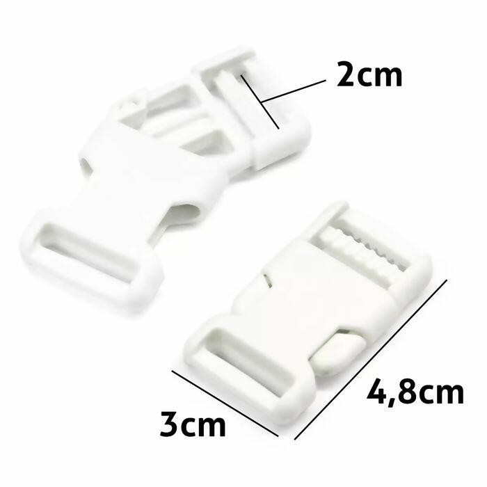 Fecho Engate Rápido, pacote contendo 20 unidades com tamanho externo de 3cm x 4,8cm e tamanho interno de 2cm. O Fecho, na cor Branco, feito totalmente de plástico resistente, é indicado para as mais diversas peças de bolsas, carteiras, pochetes, necessaires e muito mais.