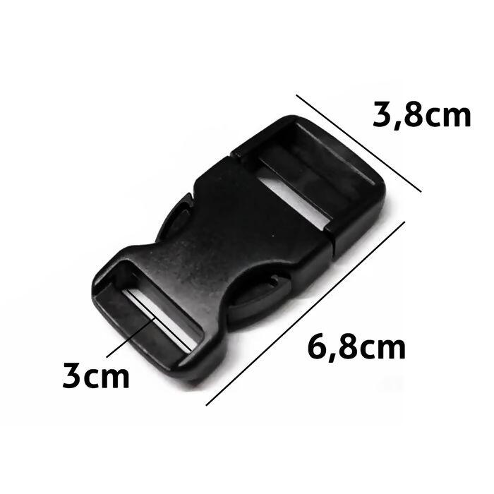 Fecho Engate Rápido, pacote contendo 20 unidades com tamanho externo de 6,8cm x 3,8cm e tamanho interno de 3cm. O Fecho, na cor Preto, feito totalmente de plástico resistente, é indicado para as mais diversas peças de bolsas, carteiras, pochetes, necessaires e muito mais.