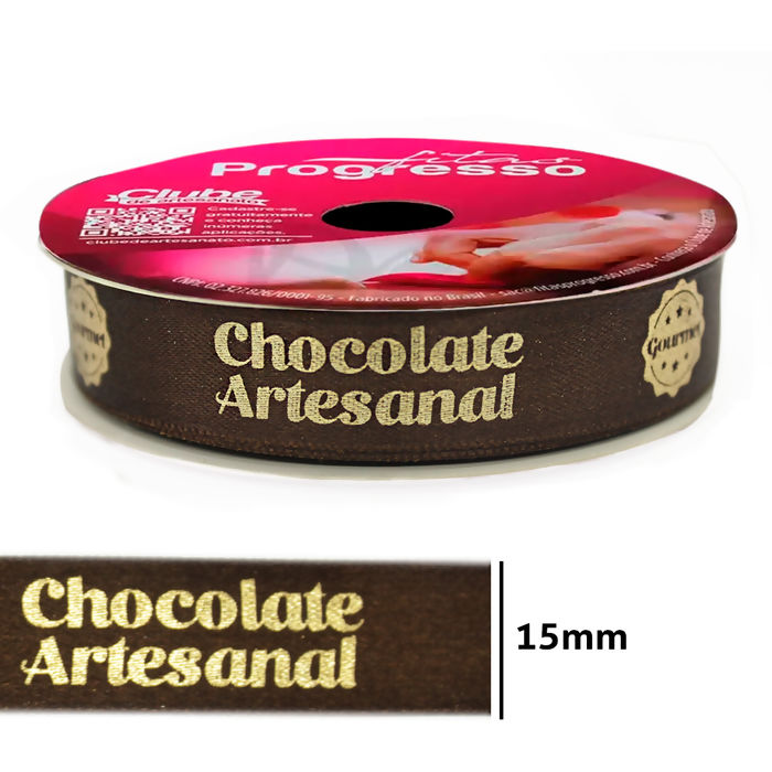Fita cetim estampada Chocolate Artesanal com 15mm, rolo contendo 10 metros. As fitas de cetim são ideais para confecção de laços, enfeites, embalagens, decoração e acessórios, possuindo um toque suave com alta resistência.