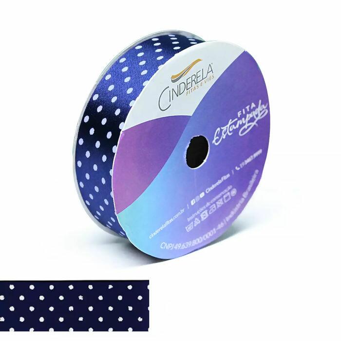 Fita de cetim com estampa de poá branco e fita azul marinho marca Cinderela de 10 metros com 20mm de largura de face simples feita totalmente em poliéster, com superfície lisa, acabamento brilhante e estrutura macia ao toque. Adiciona um detalhe delicado à sua peça com tanto em confecção quanto artesanato!