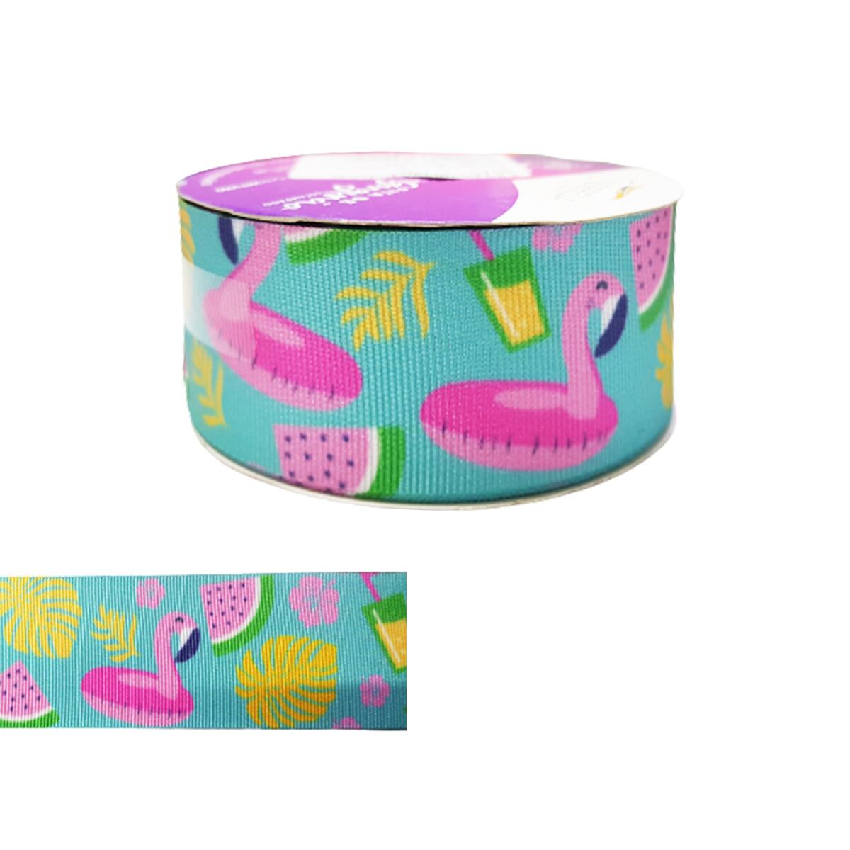 Fita estampada de gorgurão marca Cinderela, rolo contendo 10 metros de fita de 38mm de largura, feita totalmente de poliéster, as fitas de gorgurão estampada são resistentes e ótimas para a criação de laços personalizados, alças, embalagem de presente e artesanato em geral possuindo uma variedade de estampas infinitas! Modelo 884 Flamingo.