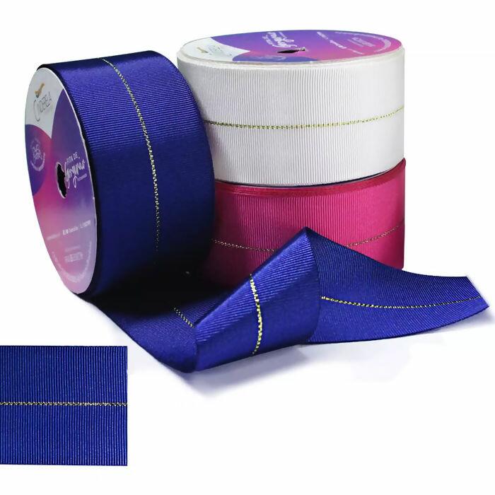 Fita de gorgurão marca Cinderela com detalhe metalizado, cada rolo contém cerca de 10 metros com 38mm de largura, produzida em poliéster, possuem desenho com ondulações em toda a sua extensão, conferindo aspecto mais firme e rígido em comparação ao cetim. Possui um detalhamento dourado no seu centro, dando um toque requintado à fita.