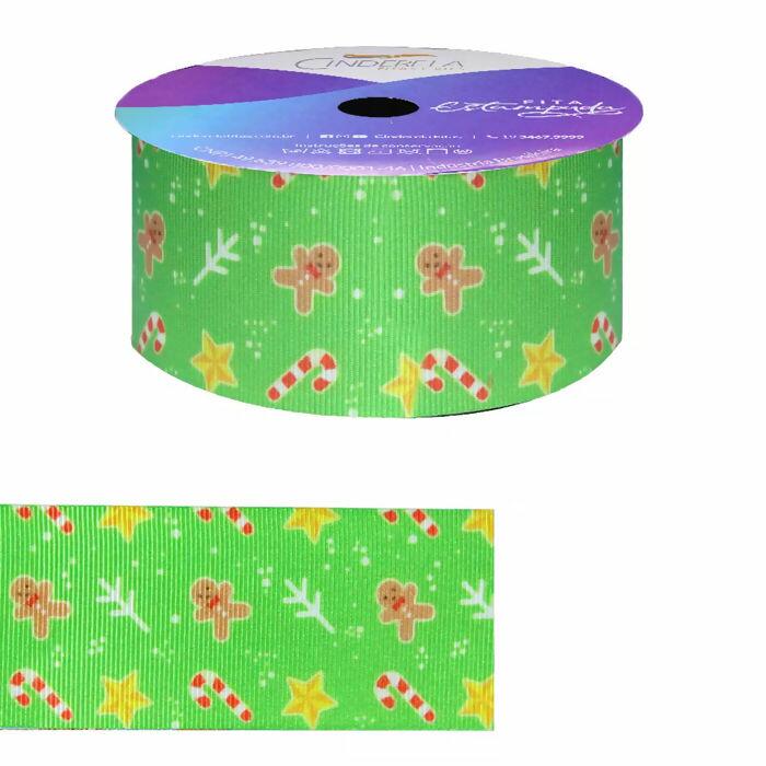 Fita estampada de gorgurão marca Cinderela, rolo contendo 10 metros de fita de 38mm de largura, feita totalmente de poliéster, as fitas de gorgurão estampada são resistentes e ótimas para a criação de laços personalizados, alças, embalagem de presente e artesanato em geral possuindo uma variedade de estampas infinitas! Modelo 258 Natal.