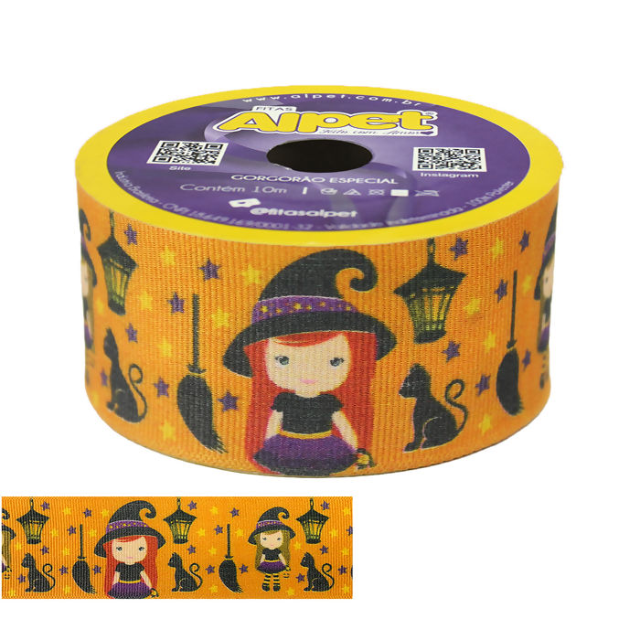 Dados Técnicos Fita Gorgurão Estampada 2852 Halloween Bruxinha Laranja 40mm 10m - 003991