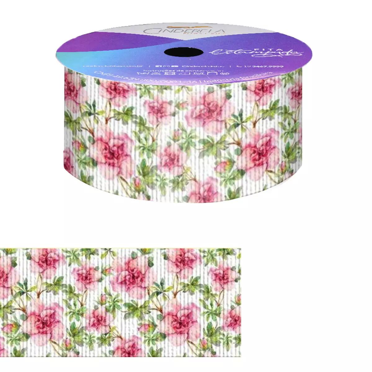 Fita estampada de gorgurão marca Cinderela, rolo contendo 10 metros de fita de 38mm de largura, feita totalmente de poliéster, as fitas de gorgurão estampada são resistentes e ótimas para a criação de laços personalizados, alças, embalagem de presente e artesanato em geral possuindo uma variedade de estampas infinitas! Modelo 770 Rosas