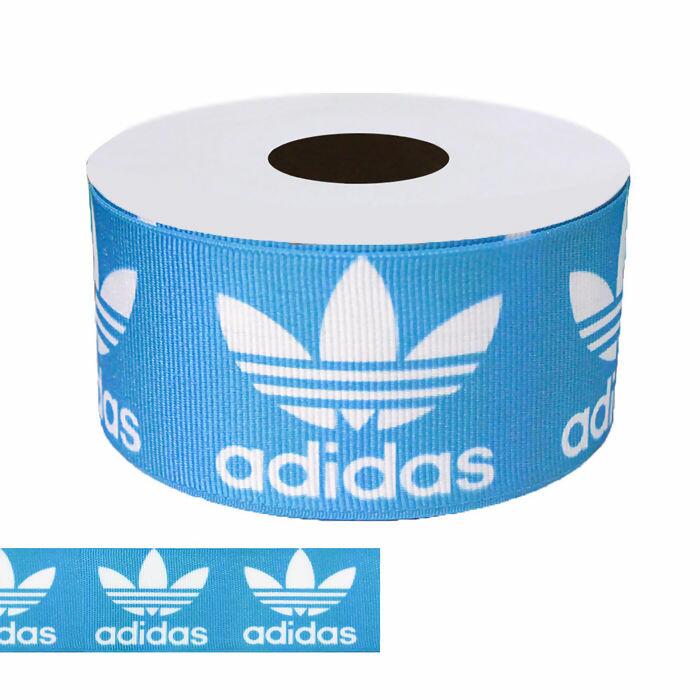 Fita estampada de gorgurão com 10 metros de fita de 38mm de largura, feita totalmente de poliéster, as fitas de gorgurão estampada são resistentes e ótimas para a criação de laços personalizados, alças, embalagem de presente e artesanato em geral possuindo uma variedade de estampas infinitas! Modelo Adidas Azul MF. 04 38mm