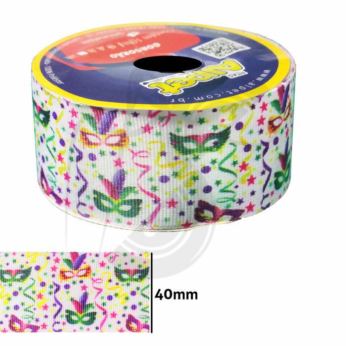 Fita estampada de gorgurão Alpet com 10 metros de fita de 40mm de largura, feita totalmente de poliéster, as fitas de gorgurão estampada são resistentes e ótimas para a criação de laços personalizados, alças, embalagem de presente e artesanato em geral possuindo uma variedade de estampas infinitas! Modelo Carnaval 2727-04