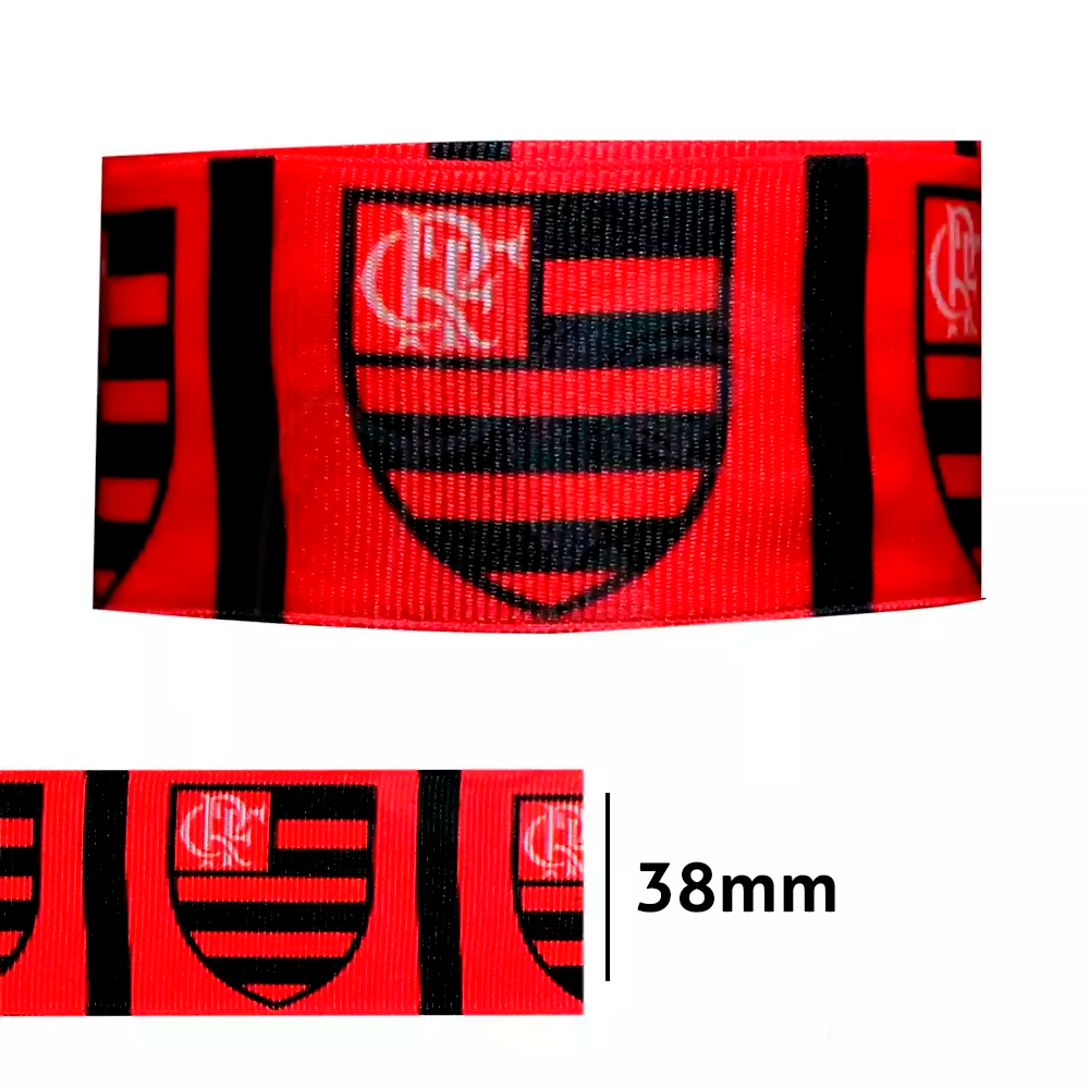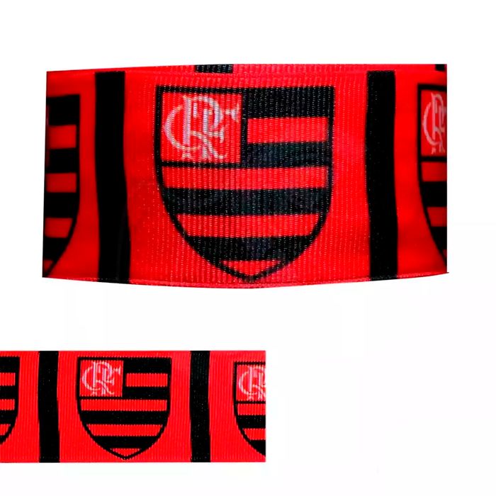 Fita estampada de gorgurão com 10 metros de fita de 38mm de largura, feita totalmente de poliéster, as fitas de gorgurão estampada são resistentes e ótimas para a criação de laços personalizados, alças, embalagem de presente e artesanato em geral possuindo uma variedade de estampas infinitas! Modelo Flamengo TM. 18