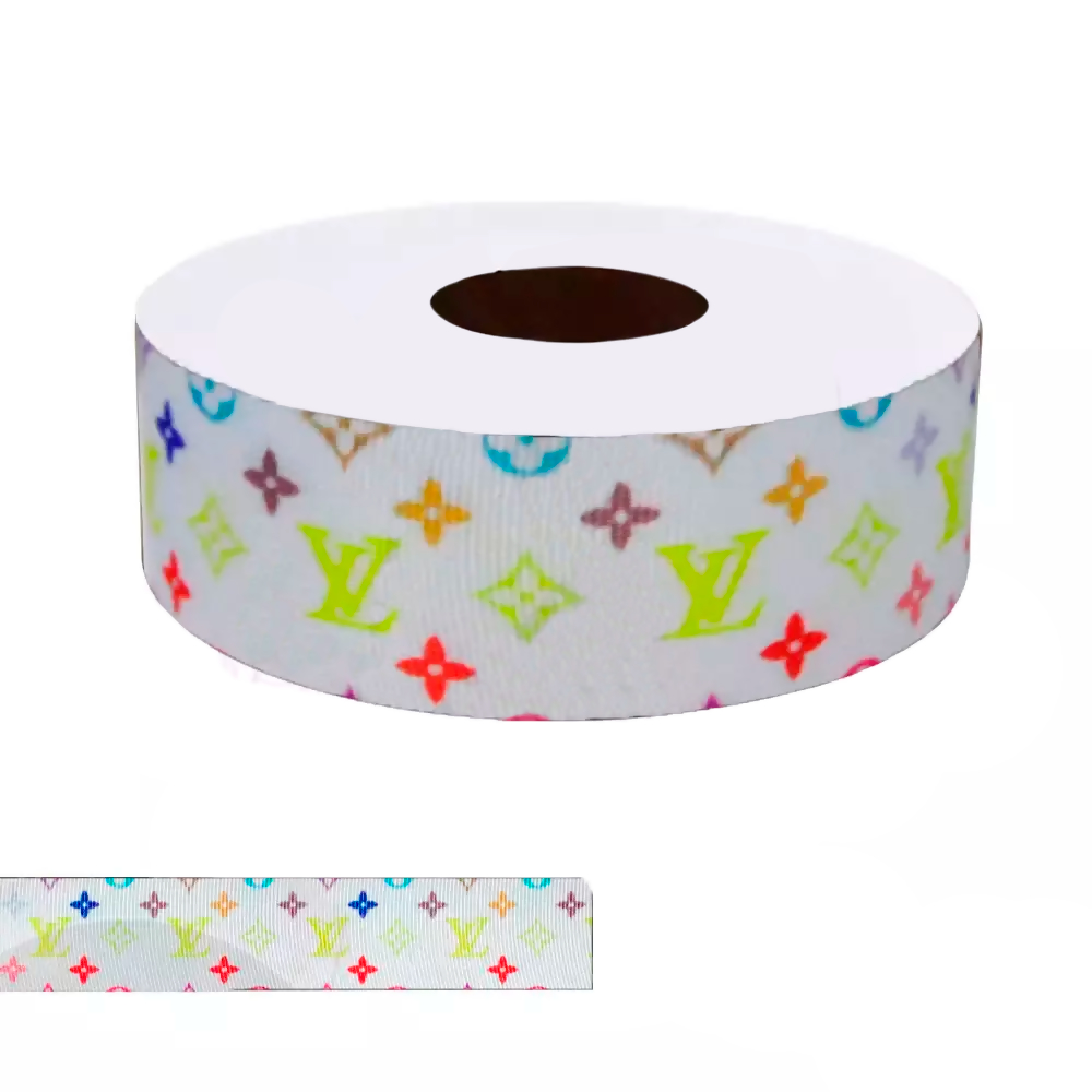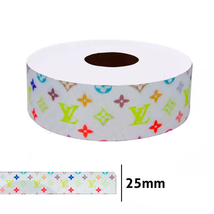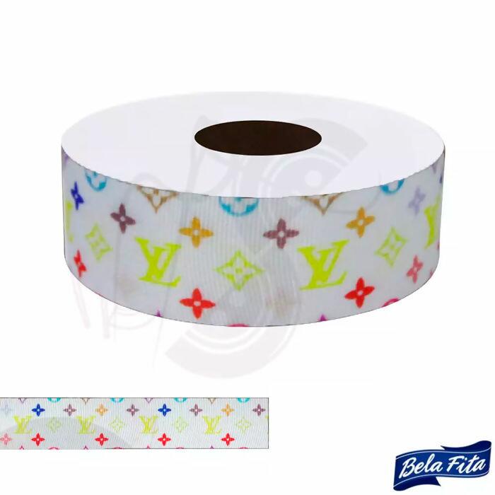 Fita estampada de gorgurão com 10 metros de fita de 25mm de largura, feita totalmente de poliéster, as fitas de gorgurão estampada são resistentes e ótimas para a criação de laços personalizados, alças, embalagem de presente e artesanato em geral possuindo uma variedade de estampas infinitas! Modelo LV Branco MF. 24 25mm