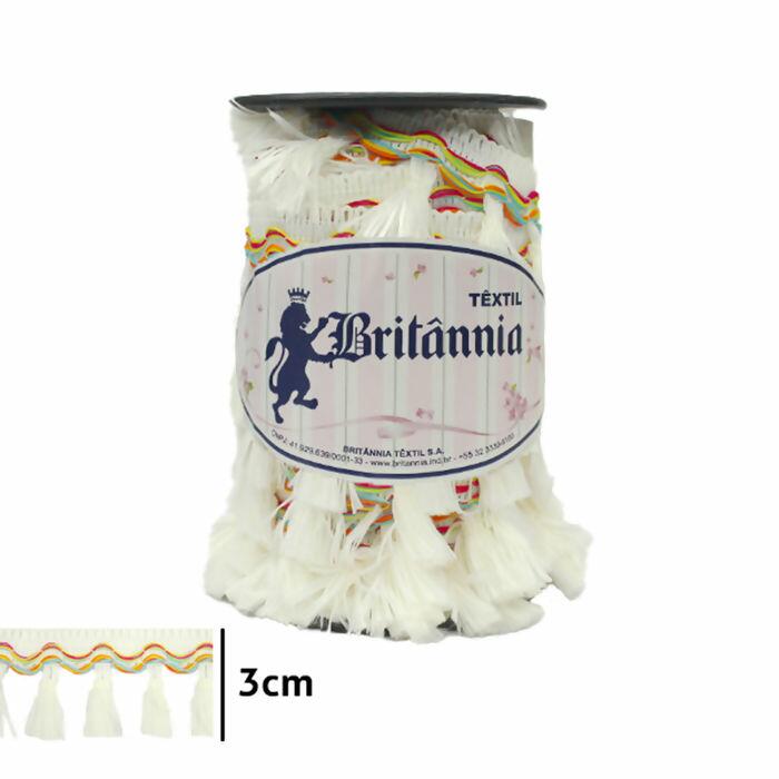 Fita Rígida Com Pingente Britânnia 9061/01P Branco, oferece um toque de sofisticação e acabamento a uma grande variedade de projetos. Cada rolo contém 10 metros com 3cm de largura. Essa fita serve como um acessório decorativo, amplamente utilizada em artesanato, vestuário e decoração de interiores para adicionar detalhes e acabamentos em peças como cortinas, toalhas e vestuário.