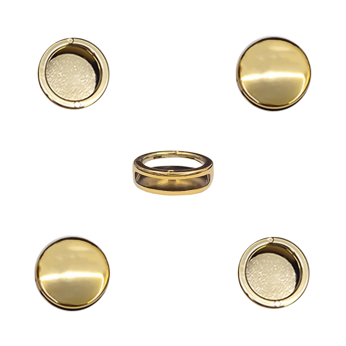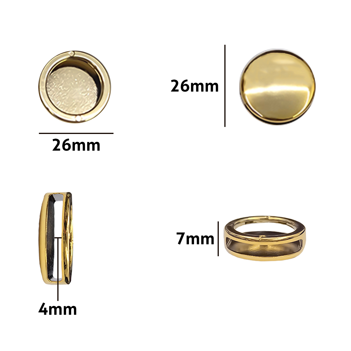 Feito totalmente de ABS Pacote com 50un Tamanho externo de 26mmx26mm e interno de 4mm Utilizado na produção e decoração de Acessórios e Calçados